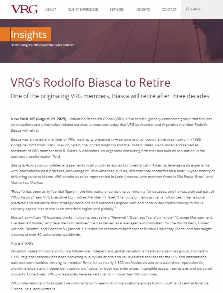 R. Biasca & Asociados was created in 1976. It is a small and prestigious Argentine consulting firm that has built its reputation in the field of business transformation. It has been in the VRG since the group's creation in 1995 until August 30, 2025. There is no single country in Continental Latin America where the firm has not worked. The primary competitive advantages include experience with international best practices, knowledge of Latin American culture, extensive global contacts, and a 50-year history of delivering value to clients.